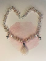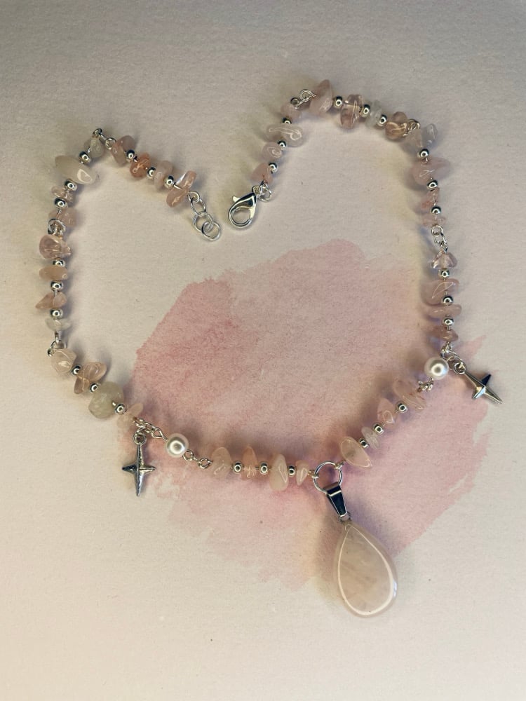 Handmade array of rose quartz crystals, pearls and charms on a unique necklace including a rose quartz pendant to centre the piece.