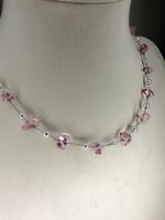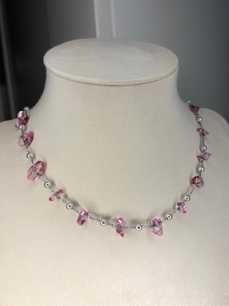 Rose and pearl themed necklace, handcrafted to look simple but delicate with a silver tone chain. A unique necklace perfect for layering or by itself. Fairly lightweight and minimal.